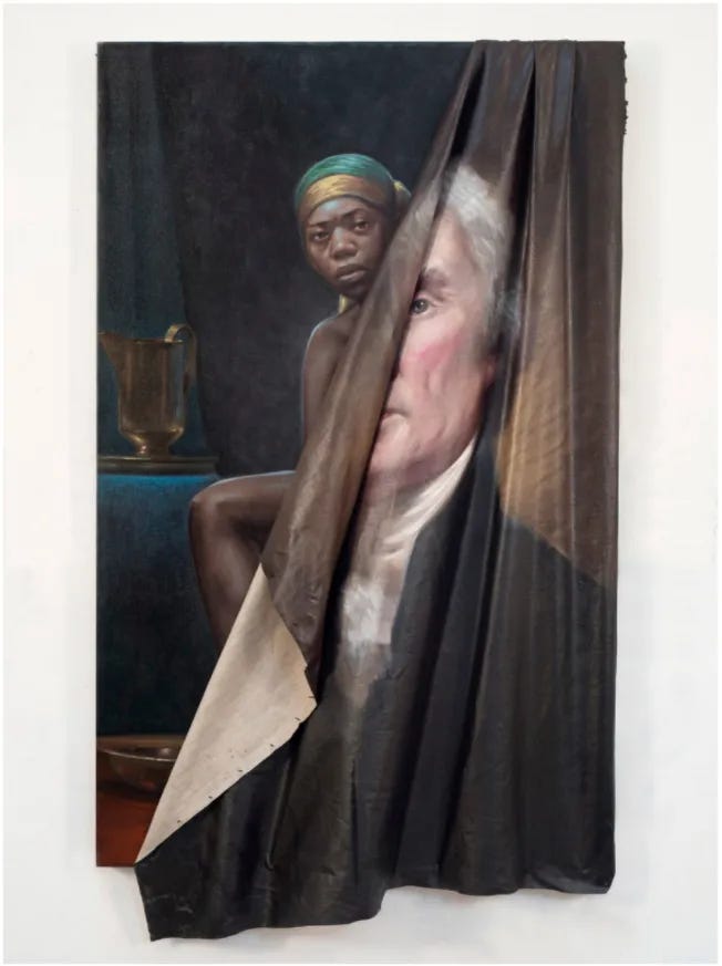I love this painting, which depicts a canvas portrait of Jefferson falling from its frame to reveal Sally Hemings—the enslaved woman Jefferson held captive for her entire life. Jefferson fathered six children with Hemings. All of them remained enslaved by him until his death.